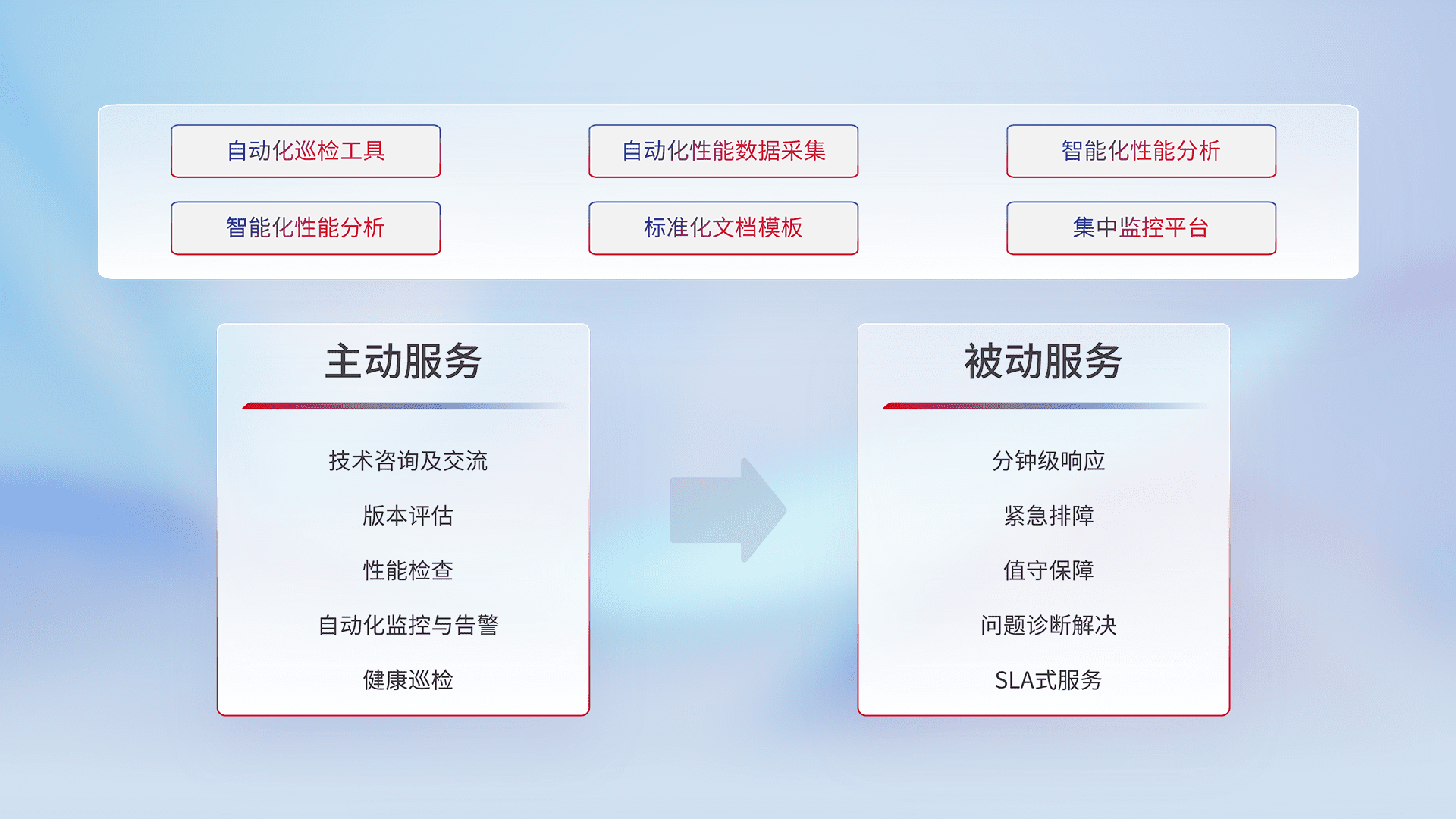智能化工具和标准化文档,,保障服务质量,,提供主动服务(包含技术咨询、、版本评估、、、、性能检查、、自动化监控与告警、、、、健康巡检)和被动服务包含(分钟级响应、、、紧急排障、、、、值守保障、、、问题诊断解决、、、、SLA服务)。。。